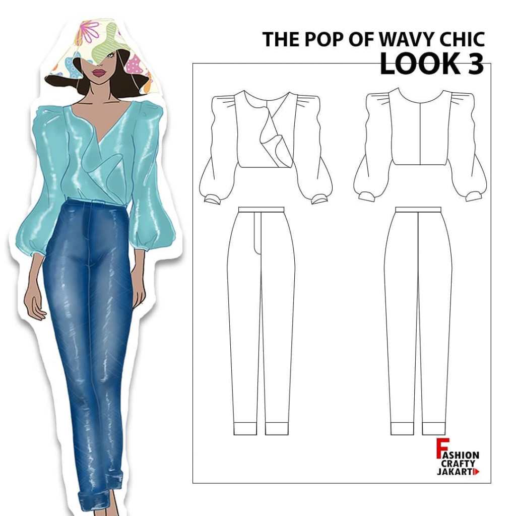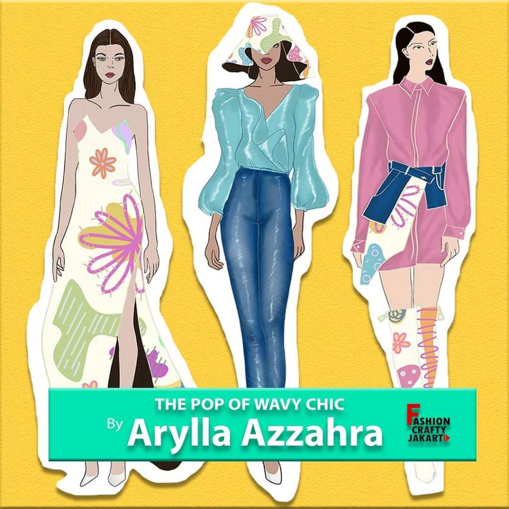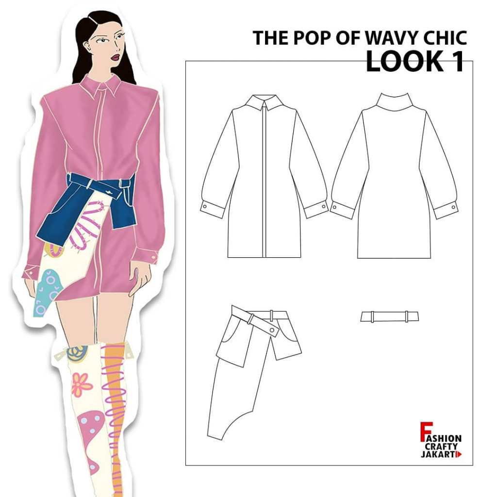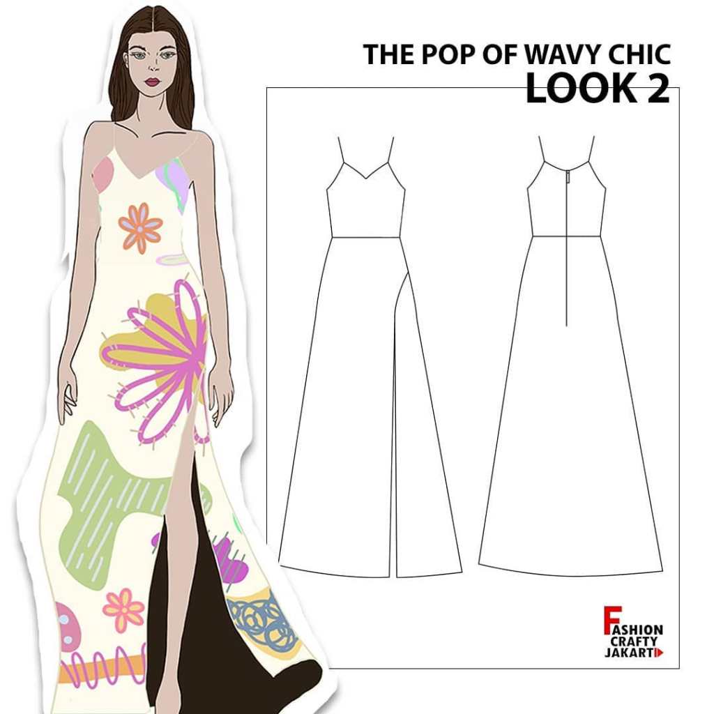 Arylla Azzahra presents a unique fashion design concept titled ‘The Pop of Wavy Chic,’ blending elements of floral aesthetics with vibrant pop art colors in a casual yet sophisticated style. The collection showcases digital illustrations, complemented by her custom fabric motifs, giving the designs a personal touch. Each piece is thoughtfully crafted to embody the energy of bold, wavy patterns, while maintaining a chic and effortless vibe. The technical drawings feature both front and back views, providing a comprehensive look at the structural details of her innovative and playful creations.